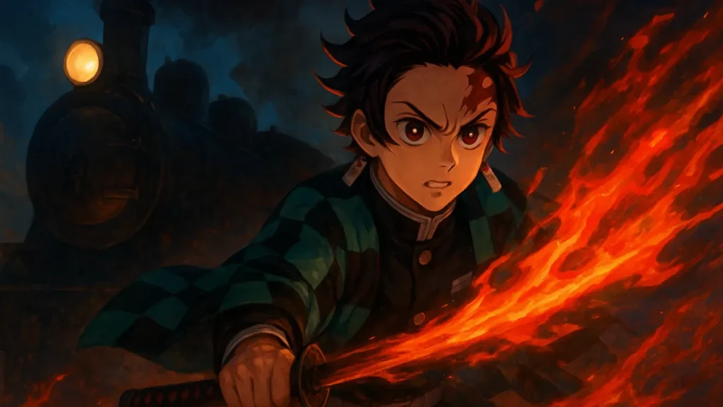 Tanjiro sempre foi o coração da história. No Trem Infinito, isso fica ainda mais claro porque a narrativa foca seu crescimento interno diante de uma ameaça poderosa.